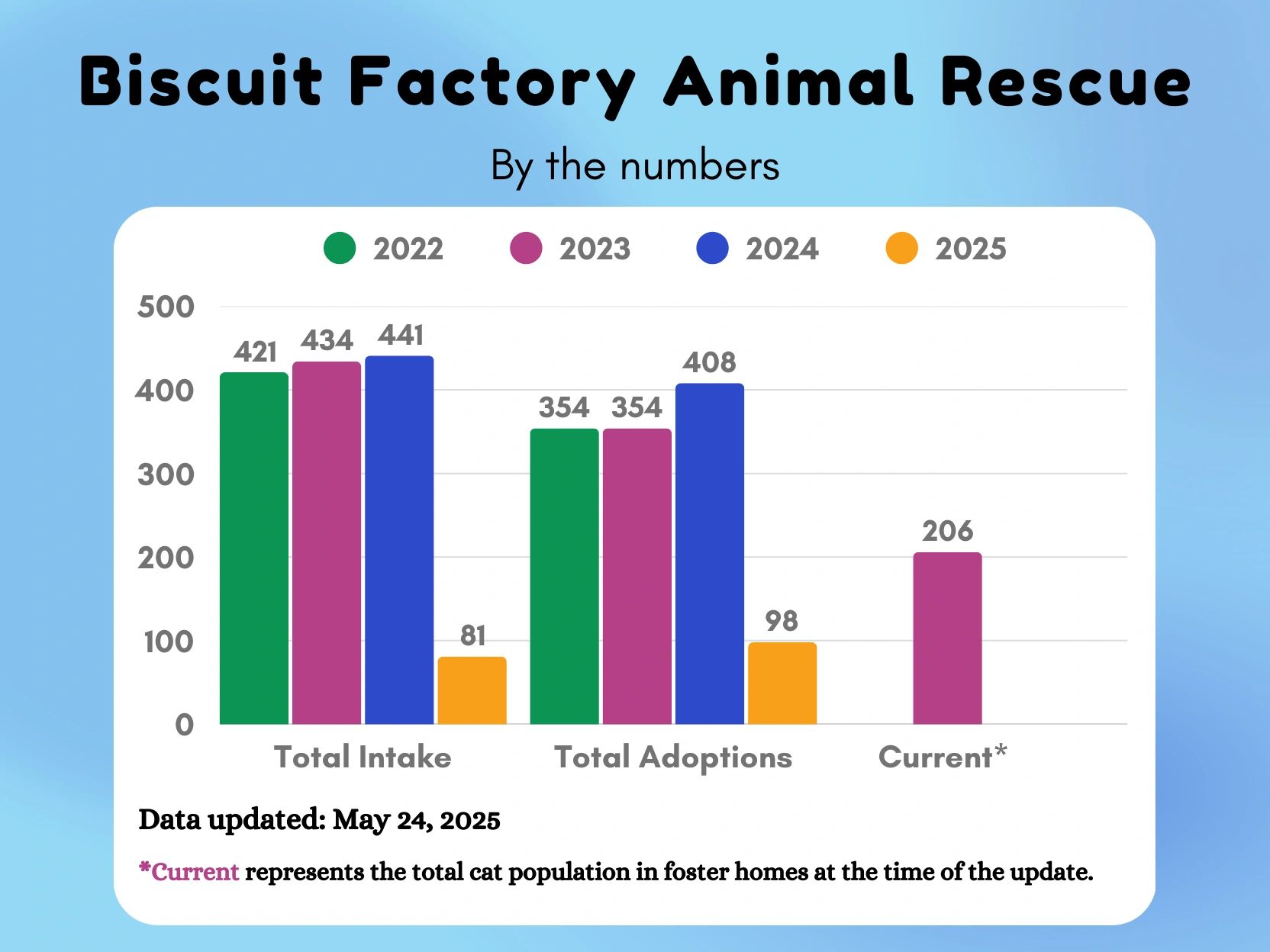Since 2021, Biscuit Factory Animal Rescue has been making a positive impact on the lives and welfare of felines in Central Indiana. Through dedication and compassion, we've found countless ways to help cats in need.